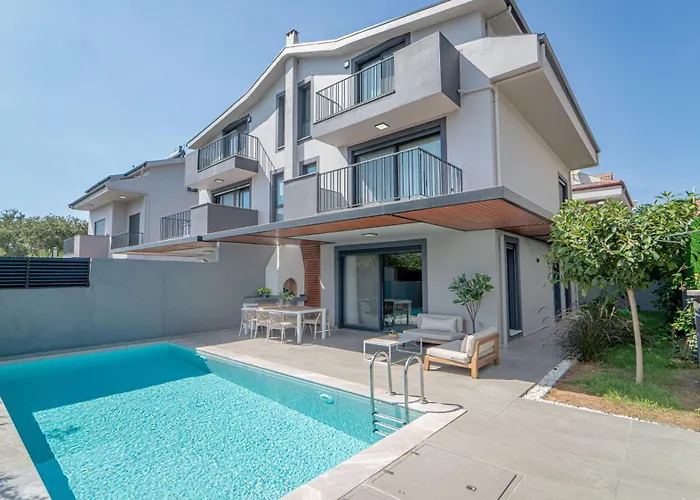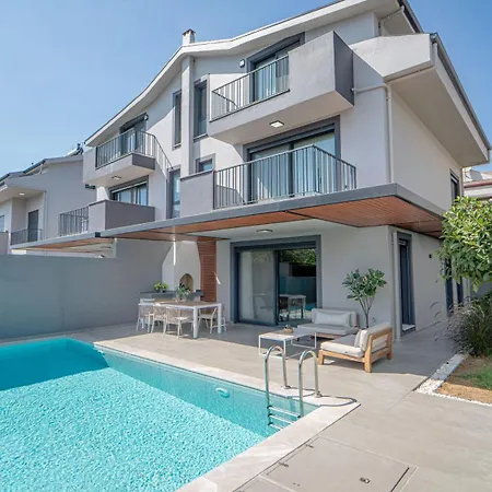 フェティエに位置するOasis Retreat Lux And Eleganceヴィラは3のベッドル-ムがある施設で,テラスとプ-ルの景色があります. スルタンズ アクアパ-クまで車で10分,エ-ス・サレイ・マリ-ナまで車で15分です.